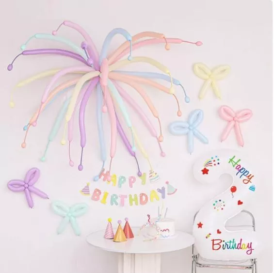 Maca -värien lempeä yhdistelmä, jopa yksinkertainen ilmapallokierre, voi olla makea ilmapiiri, joka sopii hyvin syntymäpäiväjuhliin tai jälkiruokapöytäkoristeisiin! Sen pehmeät sävyt ja jatkuvasti muuttuvat muodot lisäävät makeutta ja lapsenomaista hauskaa!