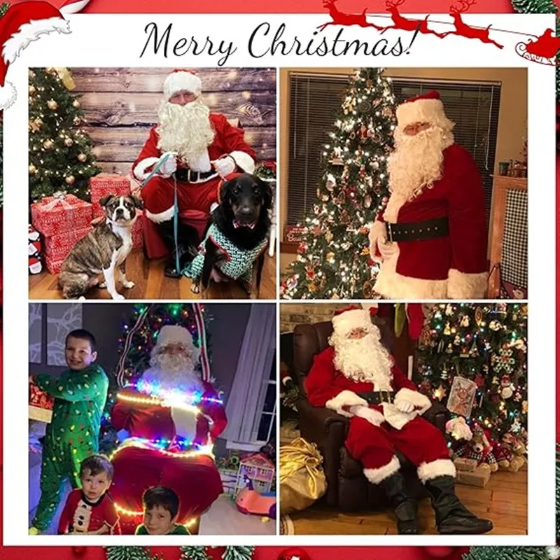 Tämä joulupukin puku on muotoiltu pehmeästä, mukavasta polyesterikankaasta, joka tarjoaa erinomaisen hengittävyyden ja lämpöä, mikä varmistaa lämpöä ja mukavuutta talvitoimintojen aikana. Pukun malli säilyttää klassisen punaisen ja valkoisen värimaailman, jonka korostetaan pörröisillä valkoisilla helmillä ja mustalla vyöllä, mikä luo silmiinpistävän visuaalisen vaikutuksen monimutkaisten yksityiskohtien kanssa. Pukuun kuuluu myös vastaava hattu ja parta, mikä on helppo käyttää ilman lisävarusteita.